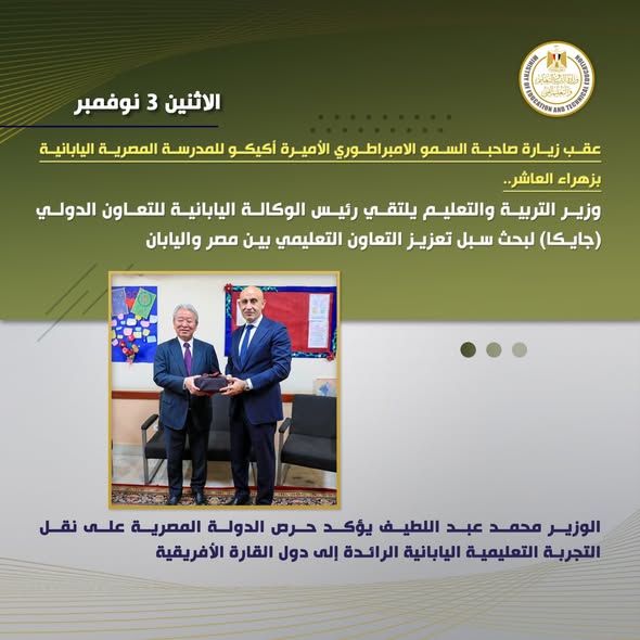 وفي ختام اللقاء، أعرب الجانبان عن تطلعهما إلى مزيد من التعاون البناء بين مصر واليابان في مجال التعليم، بما يعكس عمق الصداقة التاريخية بين البلدين ويعزز مسيرة الشراكة الاستراتيجية القائمة بينهما.