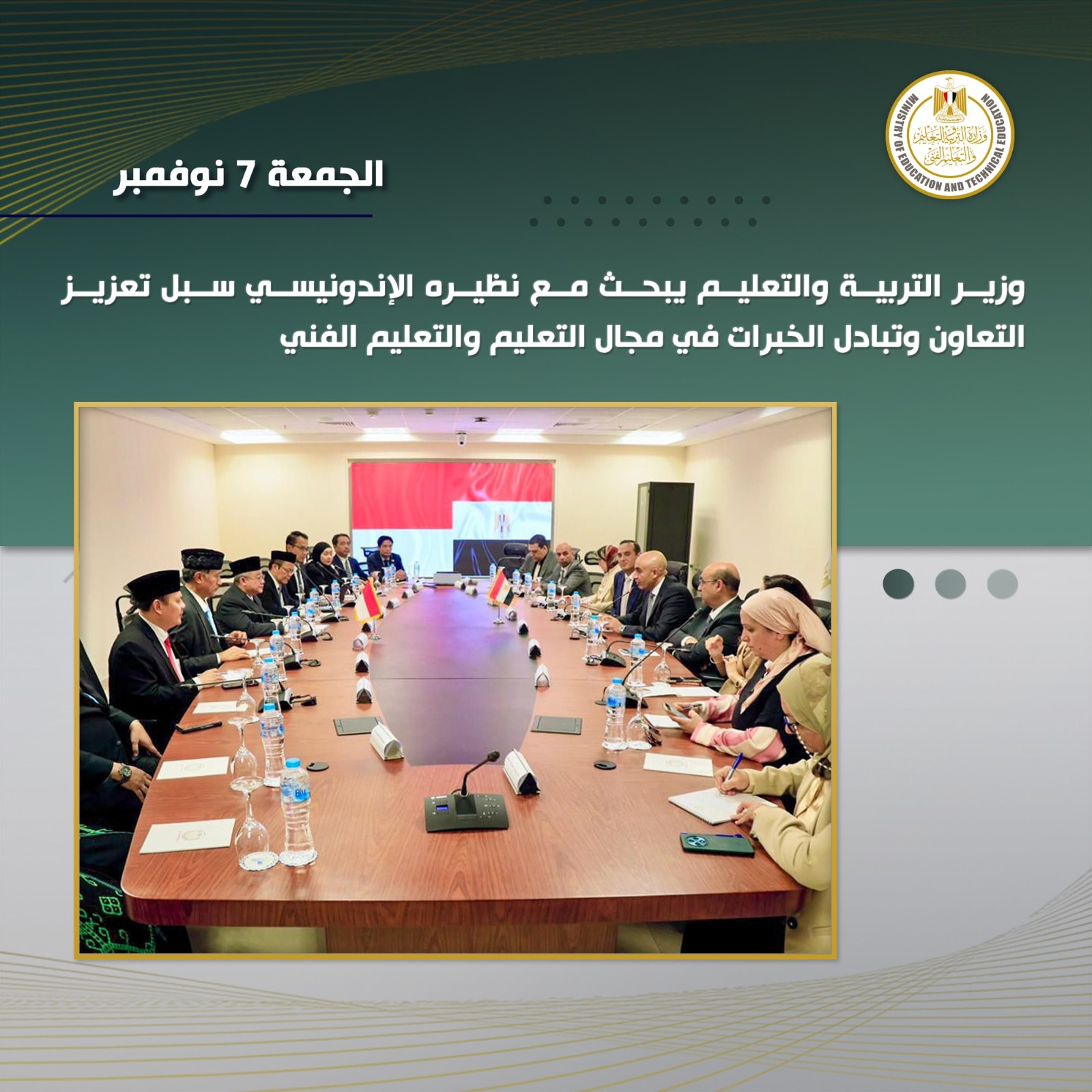 وأكد السيد الوزير محمد عبد اللطيف استعداد الوزارة الكامل لتبادل الخبرات والمناهج الفنية والتقنية مع الجانب الإندونيسي، وتقديم الدعم اللازم، انطلاقًا من العلاقات الوثيقة التي تجمع البلدين، والرغبة المشتركة في تعزيز التعاون في مجال التعليم والتعليم الفني.