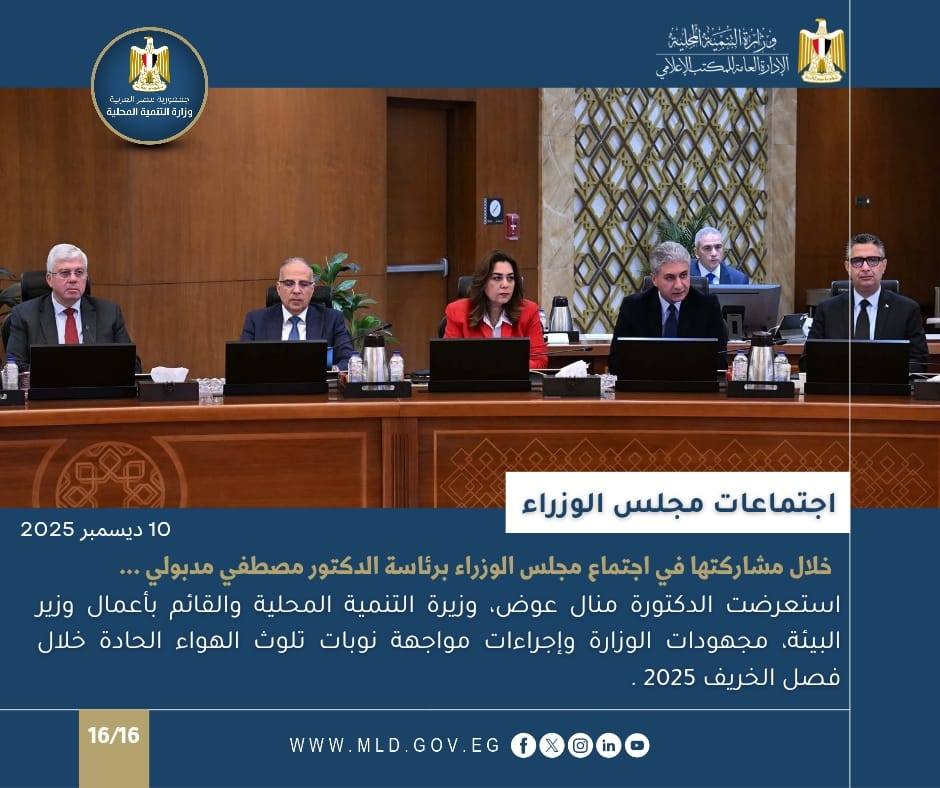 واستعرضت الدكتورة منال عوض، وزيرة التنمية المحلية والقائم بأعمال وزير البيئة، مجهودات الوزارة وإجراءات مواجهة نوبات تلوث الهواء الحادة خلال فصل الخريف 2025، وذلك خلال اجتماع مجلس الوزراء، والذي انعقد برئاسة الدكتور مصطفى مدبولي رئيس مجلس الوزراء، بمقر الحكومة بالعاصمة الجديدة.