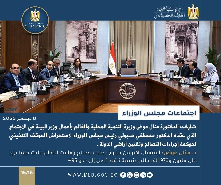 كما شاركت الدكتورة منال عوض وزيرة التنمية المحلية والقائم بأعمال وزير البيئة، في الاجتماع الذي عقده الدكتور مصطفى مدبولي، رئيس مجلس الوزراء، لاستعراض الموقف التنفيذي لحوكمة إجراءات التصالح وتقنين أراضي الدولة، وخلال الاجتماع، قدمت د. منال عوض شرحًا لمعدلات الأداء ونسب التنفيذ الخاصة بدورة تقنين الأوضاع خلال الفترة الممتدة من 3 يوليو من العام الماضي وحتى تاريخ 7 ديسمبر؛ حيث بلغ إجمالي عدد طلبات التقنين حوالي 237 ألفا و638 طلبًا، كما استعرضت التوزيع الجغرافي لهذه الطلبات بمختلف المحافظات، مشيرةً إلى معدلات الأداء ونسب التنفيذ للدورة خلال الفترة الممتدة من 3 يوليو من العام الماضي حتى الآن.
