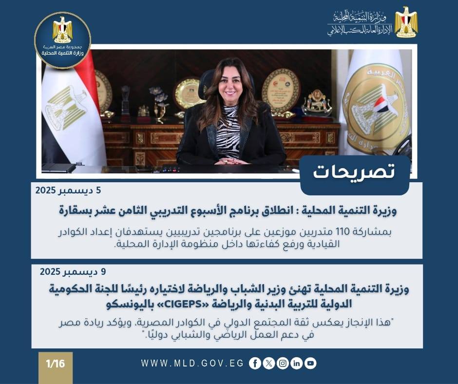 أعلنت الدكتورة منال عوض وزيرة التنمية المحلية، عن انطلاق برامج الأسبوع التدريبي الثامن عشر من الخطة التدريبية 2025/ 2026 بمركز التنمية المحلية للتدريب بسقارة خلال الفترة من 7 وحتى 10 ديسمبر 2025، بمشاركة 110 متدربين موزعين على برنامجين تدريبيين يستهدفان إعداد الكوادر القيادية ورفع كفاءتها داخل منظومة الإدارة المحلية.