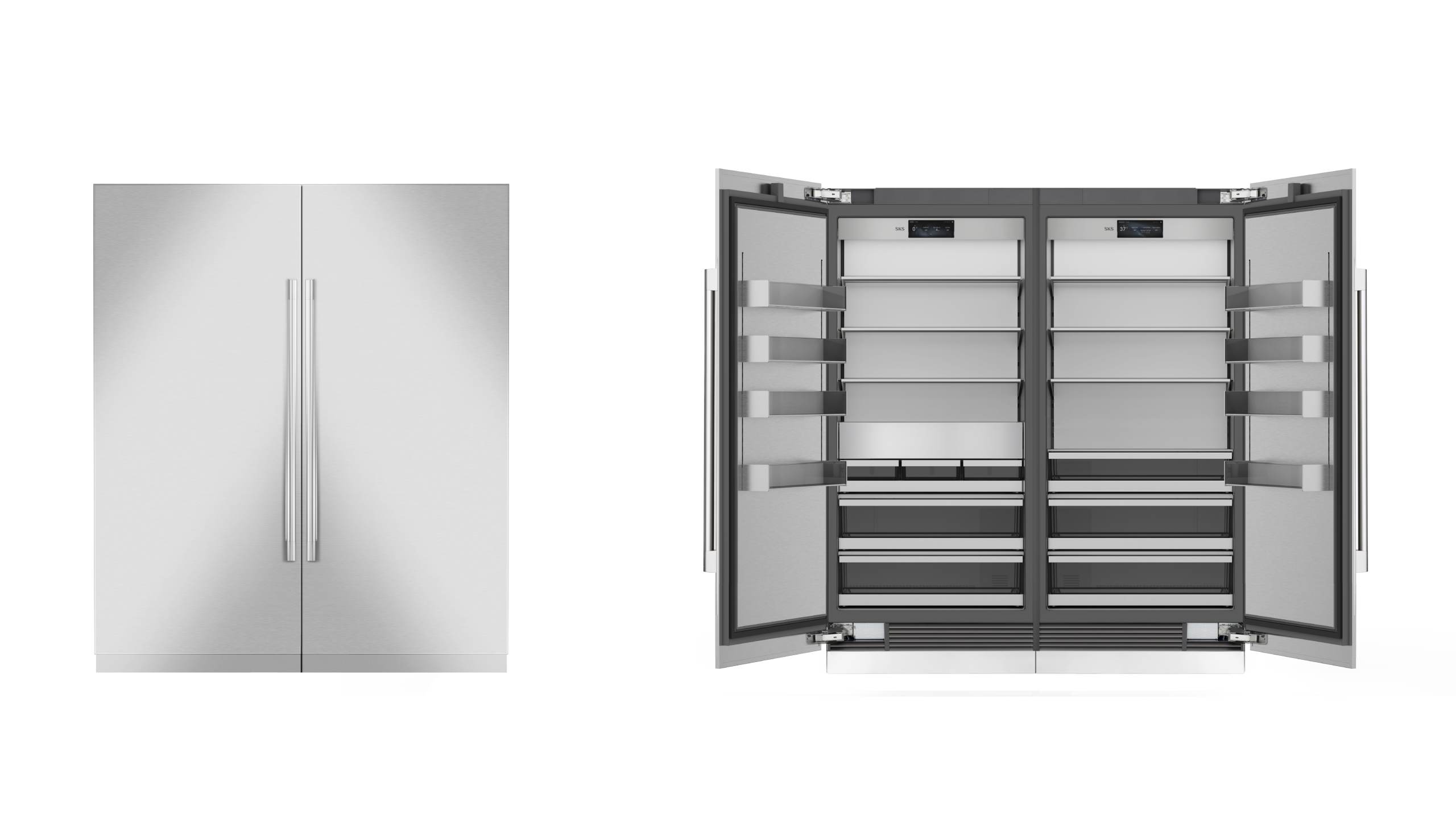 تقدم SKS لأول مرة ثلاجة وفريزر مدمجين عمودياً بعرض 36 بوصة. ويتميز المنتجان بتصميم قابل لتركيب واجهة خارجية تتناسق مع تصميم المطبخ (Panel-Ready)، مما يمنح العملاء حرية استخدام ألواح أبواب مخصصة أو ألواح الفولاذ المقاوم للصدأ الخاصة من SKS. ويمتزج الجهازان بانسيابية مع تصميم المطبخ ويوفران مظهرًا مدمجًا أنيقًا إلى جانب تحقيق أقصى استفادة من السعة التخزينية.