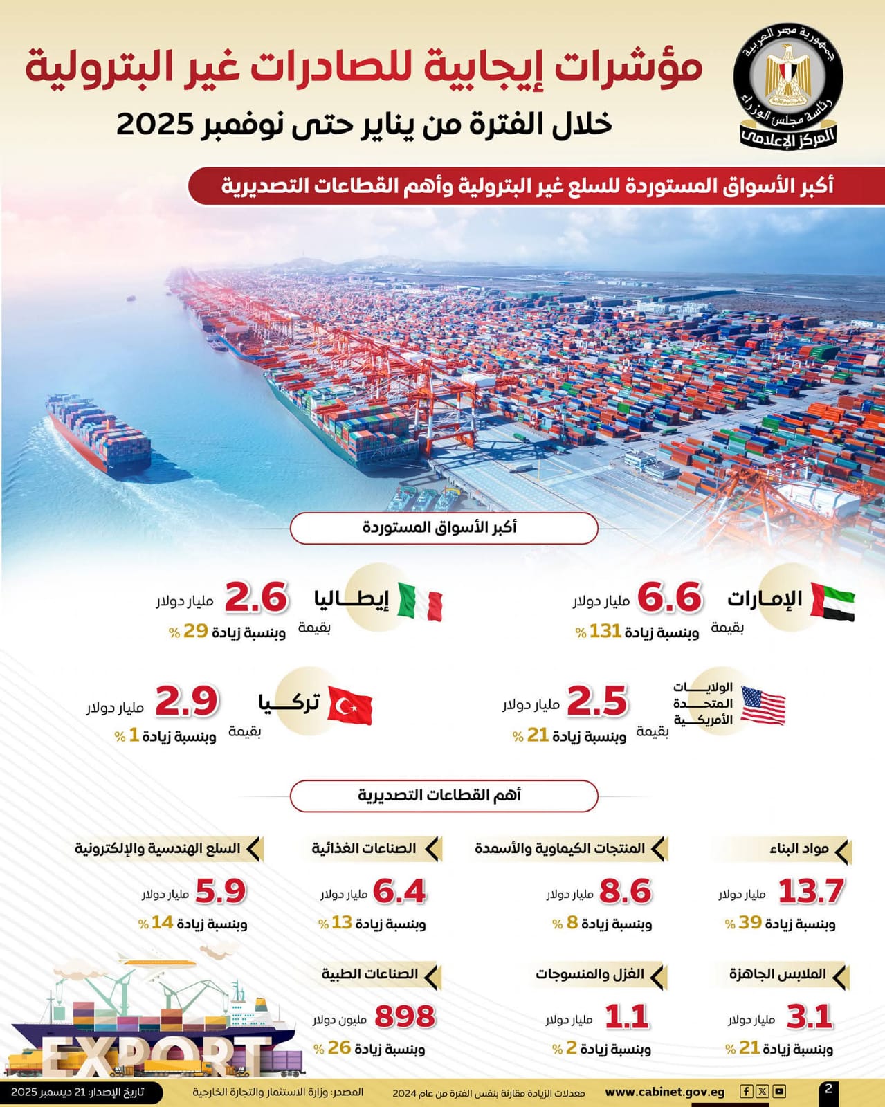 وأشارت الإنفوجرافات إلى زيادة قيمة الصادرات غير البترولية بنسبة 18.4%، لتصل إلى 44.4 مليار دولار خلال الفترة من يناير حتى نوفمبر 2025، مقابل 37.5 مليار دولار خلال الفترة ذاتها من عام 2024.