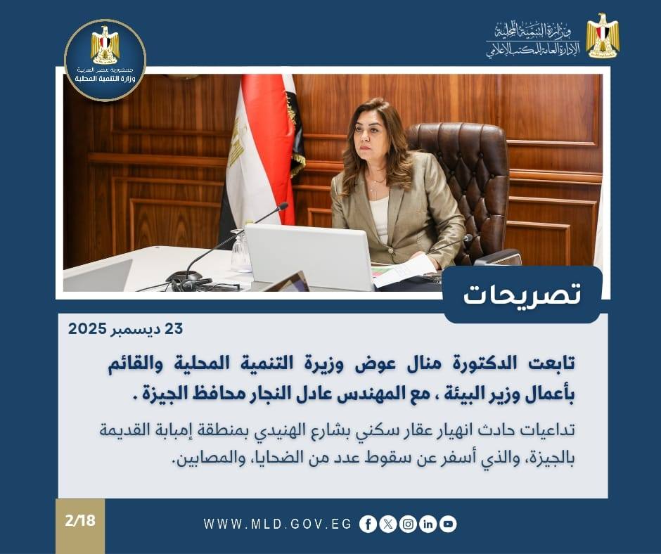 كما تابعت الدكتورة منال عوض وزيرة التنمية المحلية ، مع المهندس عادل النجار محافظ الجيزة تداعيات حادث انهيار عقار سكني بشارع الهنيدي بمنطقة إمبابة القديمة بالجيزة، والذي أسفر عن سقوط عدد من الضحايا، والمصابين.