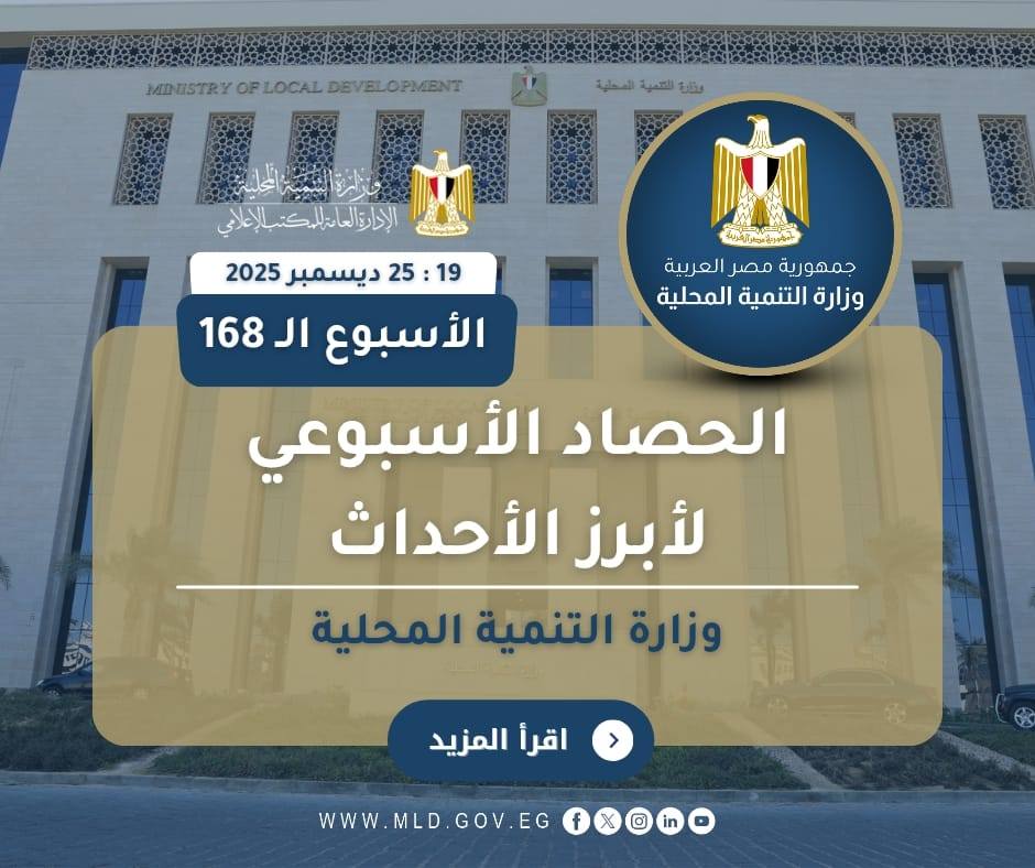 أصدر المركز الإعلامي لوزارة التنمية المحلية “الانفوجراف الأسبوعي” في نسخته الـ 168 حول أبرز أنشطة وفعاليات الوزارة بقيادة الدكتورة منال عوض وزيرة التنمية المحلية، حيث تضمن مجموعة من الفعاليات والاجتماعات ومتابعة المشروعات التنموية المهمة خلال الفترة (19 : 25 ديسمبر 2025).