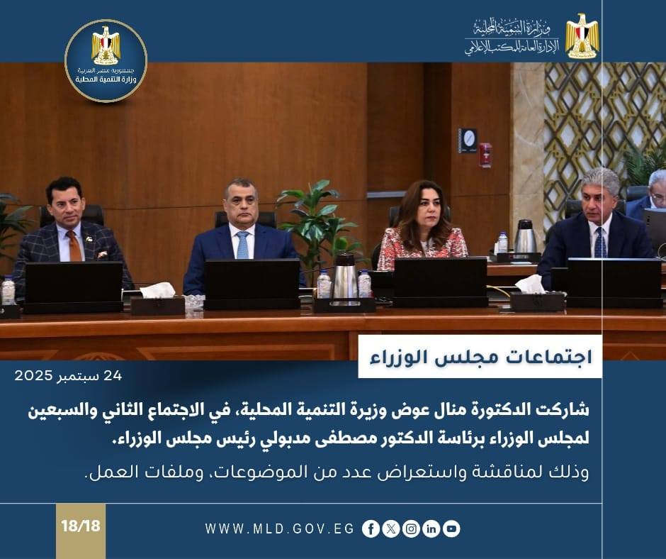 وشاركت الدكتورة منال عوض وزيرة التنمية المحلية والقائم بأعمال وزير البيئة، في الاجتماع الأسبوعي للحكومة بمقرها في العاصمة الجديدة؛ برئاسة الدكتور مصطفى مدبولي رئيس مجلس الوزراء، وذلك لمناقشة عدد من الملفات والموضوعات.