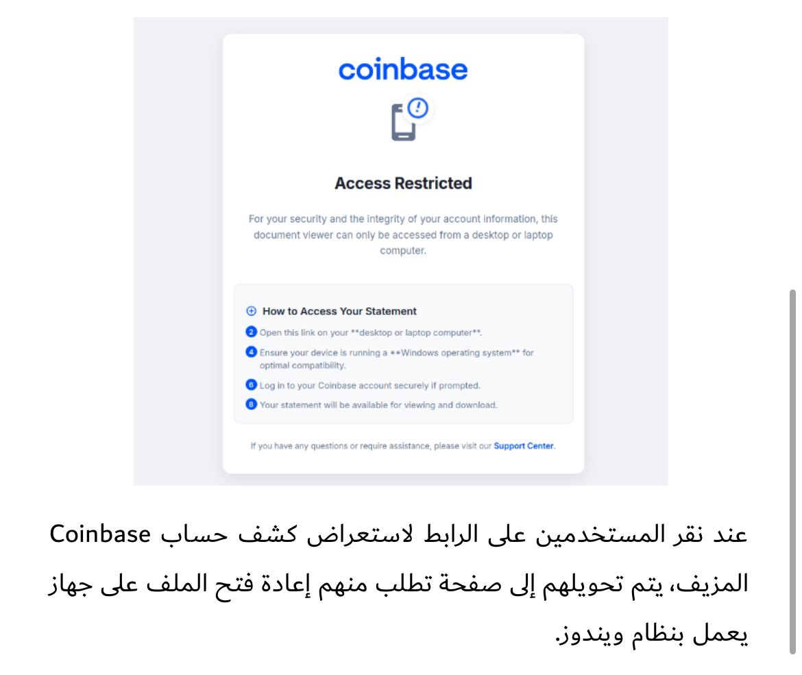 بدأ الهجوم عبر رسالة بريد إلكترونية زائفة تدعو المستخدمين إلى الضغط على رابط لمراجعة كشف حسابهم في منصة Coinbase، وادّعى المهاجمون أن الاطلاع على الكشف متاح فقط من خلال أجهزة ويندوز المكتبية أو المحمولة، في محاولة لخداع المستخدمين ودفعهم إلى تنزيل الملف وفتحه على تلك الأجهزة.