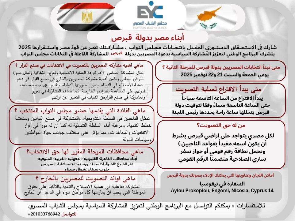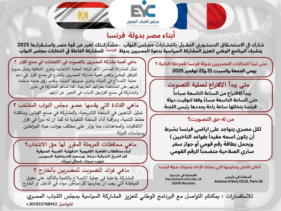 يواصل البرنامج الوطني لتعزيز المشاركة السياسية بالشراكة مع برنامج تعزيز مشاركة المصريين بالخارج في الشأن العام جهودهما التوعوية لدعم مشاركة المصريين بالخارج في المرحلة الثانية من انتخابات مجلس النواب 2025، وذلك بعد النجاح الملحوظ الذي حققته المبادرة خلال المرحلة الأولى، والتي شهدت تفاعلًا واسعًا من أبناء الجاليات المصرية في الخارج.