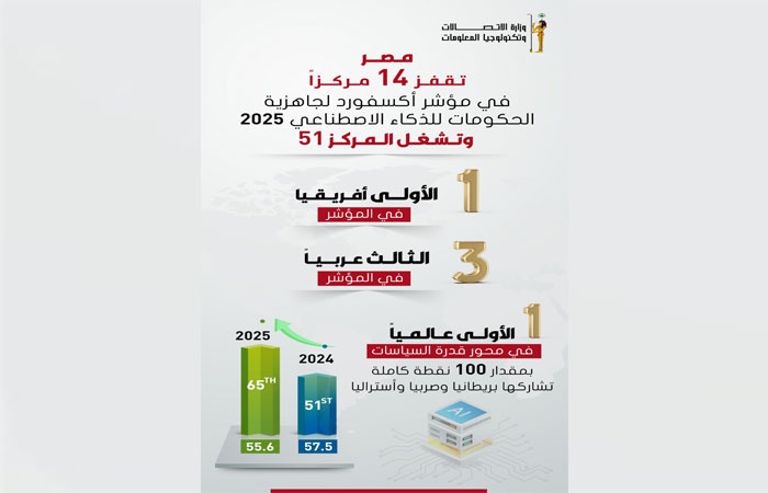 جاءت مصر فى المرتبة الأولى إفريقيًا فى مؤشر جاهزية الحكومات للذكاء الاصطناعى لعام 2025 الصادر عن Oxford Insights، حيث تقدمت 14 مركزًا في المؤشر لتشغل المركز 51 عالميًا من بين 195 دولة، محققة 57.5 نقطة، مقارنة بالمركز 65 من بين 188 دولة محققة 55.6 نقطة فى عام 2024. كما جاءت مصر فى المرتبة الثالثة عربيًا، مقابل المركز السابع عربيًا فى العام الماضى.