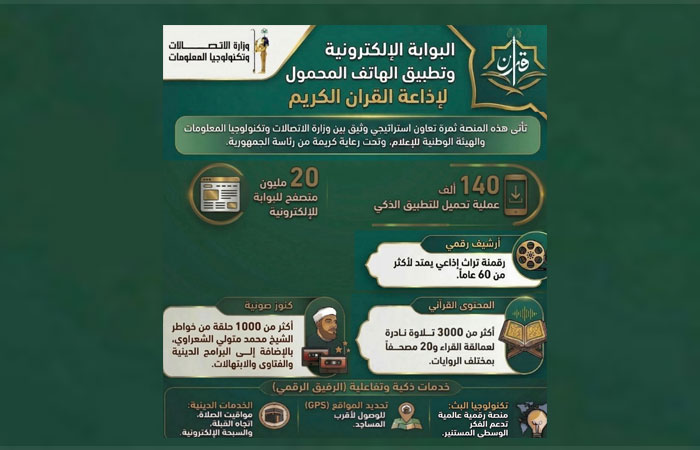 هذا وقد سخرت وزارة الاتصالات وتكنولوجيا المعلومات كافة إمكاناتها الفنية لإنشاء منصة رقمية متكاملة قادرة على استيعاب أرشيف يمتد لأكثر من 60 عاماً، وقد شملت جهود الوزارة في عملية الإنشاء برمجة تطبيق ذكي يتيح الوصول لأكثر من 3000 تلاوة نادرة لكبار القراء وأكثر من 20 مصحفاً كاملاً بمختلف الروايات والتعاون في تحويل الكنوز الصوتية، ومنها أكثر من 1000 حلقة لخواطر الشيخ الشعراوي فضلا عن مكتبة ثرية من البرامج الدينية والفتاوى والابتهالات.