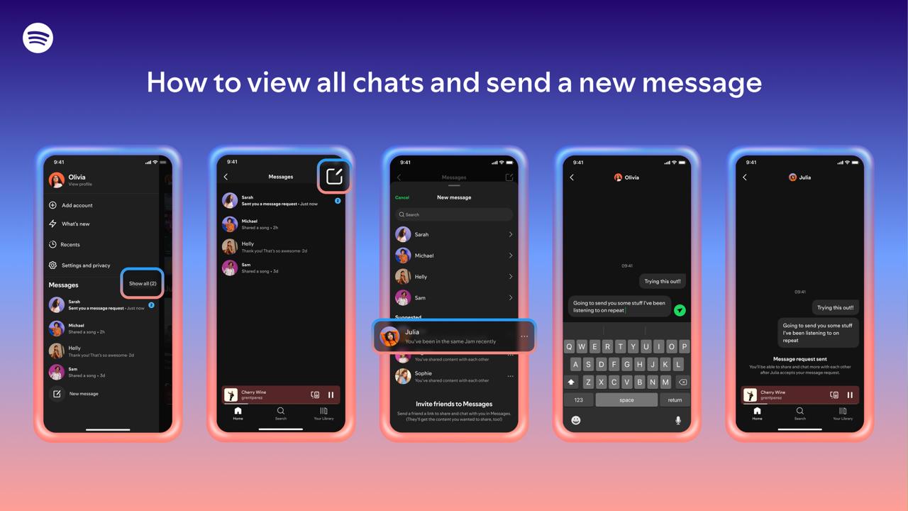 يمكن الوصول إلى Messages (الرسائل) من خلال النقر على صورة الملف الشخصي في الزاوية العلوية اليسرى من التطبيق، كما سيقترح Spotify أشخاصًا للتواصل معهم بناءً على التفاعلات السابقة مثل مشاركة المقاطع، أو الانضمام إلى “Jams” أو “Blends”، أو إنشاء قوائم تشغيل مشتركة، أو الاشتراك في خطة “العائلة” أو “الثنائي” (Family/Duo).