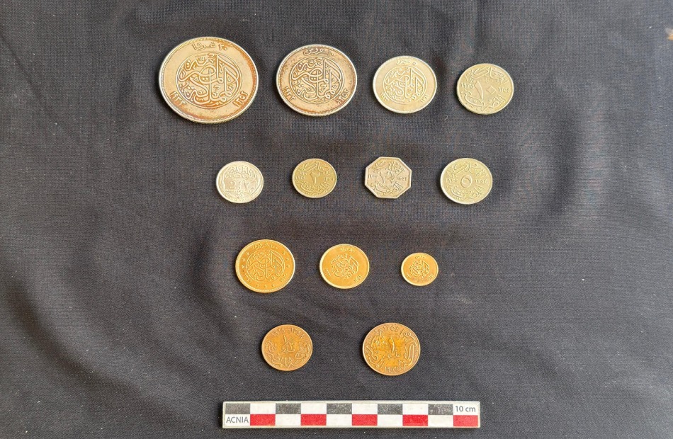 كما عثر بداخلها على ثلاث عشرة قطعة نقدية من فئات مختلفة، تراوحت ما بين المليمات والعملات الذهبية من فئة 100 قرش.