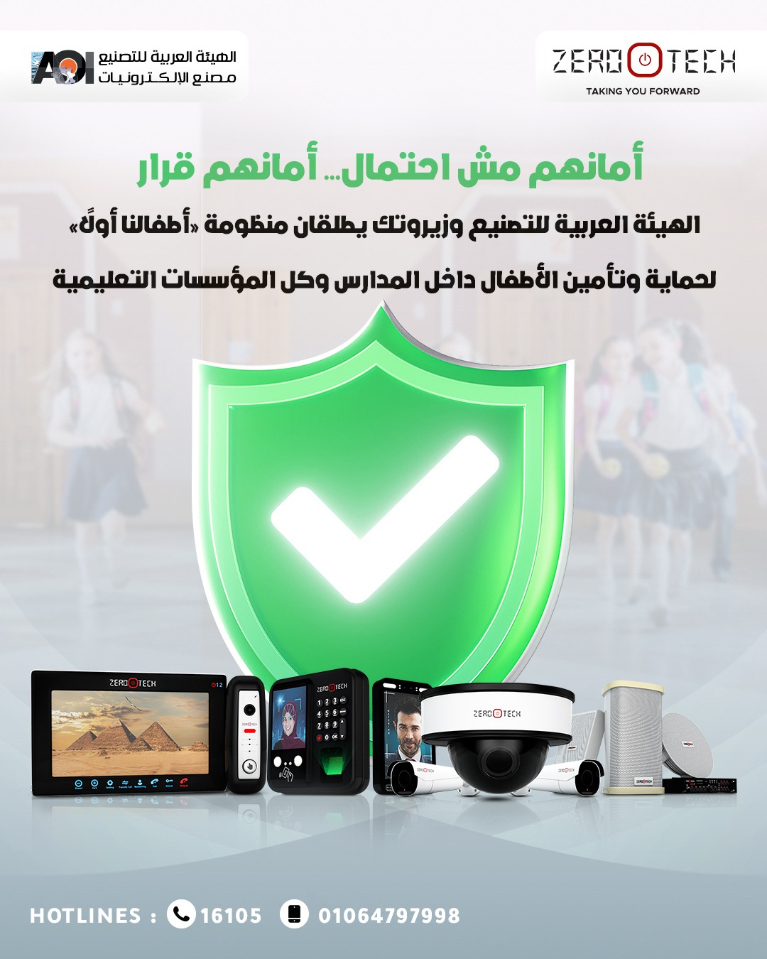 ومن هذا المنطلق،  أطلقت الهيئة العربية للتصنيع وزيروتك كأول مصنع مصري للأنظمة الأمنية، منظومة متكاملة تحت اسم «أطفالنا أولًا» وهي منظومة ذكية شاملة تهدف إلى توفير أعلى درجات الحماية والمتابعة داخل المدارس وجميع المؤسسات التعليمية، من خلال حلول تكنولوجية متطورة تم تصميمها خصيصًا لتناسب البيئة التعليمية واحتياجاتها الواقعية.