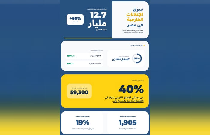 قفز إجمالي الإنفاق على الإعلانات الخارجية في مصر بنسبة 60% خلال عام 2025، ليصل إلى 12.7 مليار جنيه، وفقا للتقرير السنوي السادس لشركة AdMazad حول حالة سوق الإعلانات الخارجية.